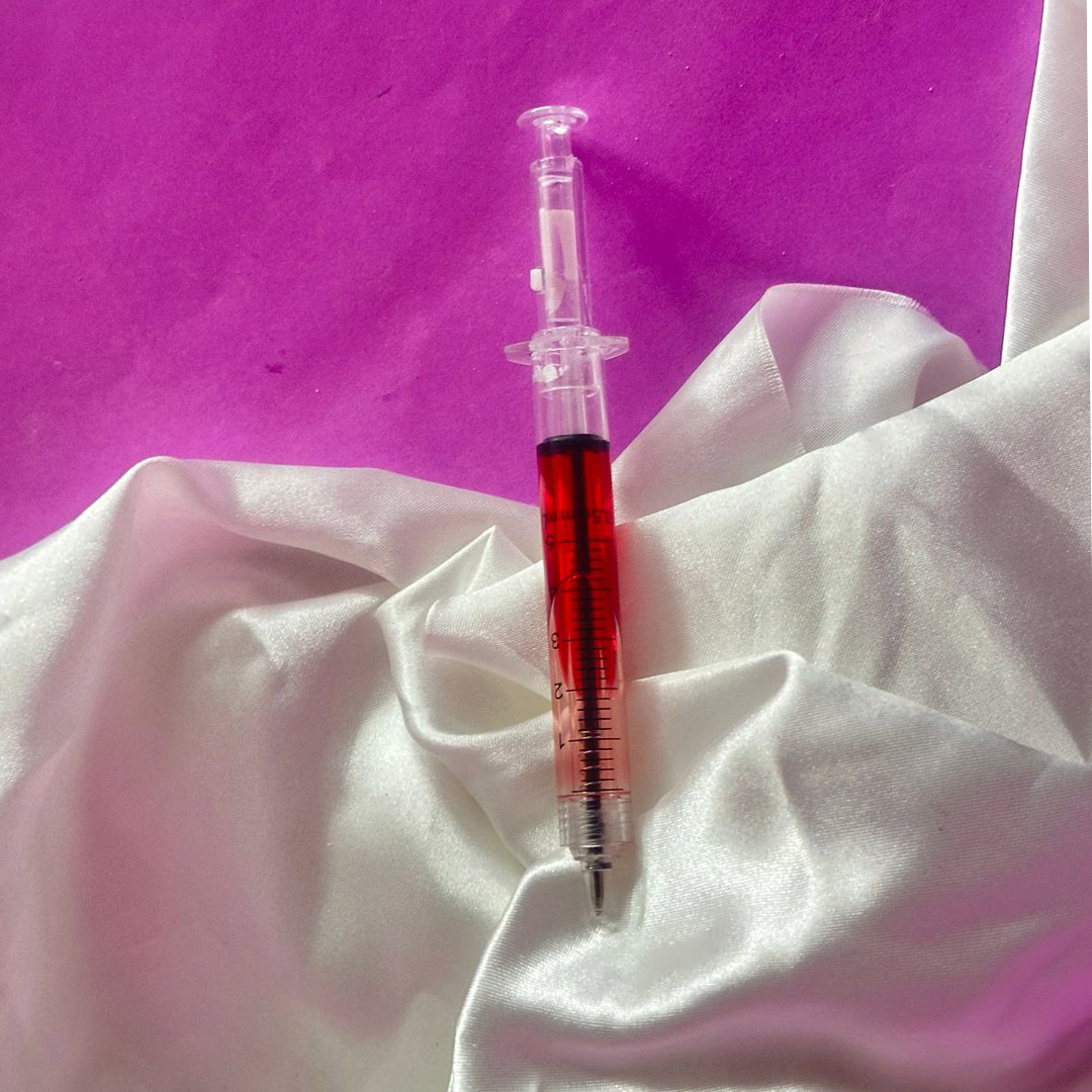 Caneta seringa – Esferográfica e cor do líquido decorativo vermelho